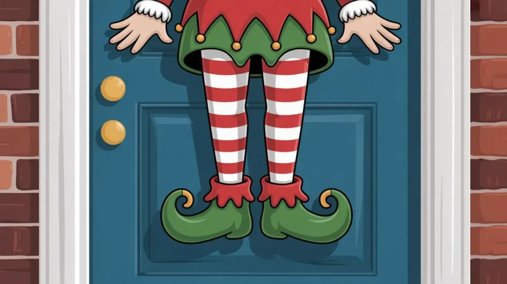 Let’s get silly! This door hanger is pure, unadulterated fun. It’s designed to look like a pair of elf legs—complete with striped tights, pointy shoes with jingle bells, and a fluffy cuff—dangling from a festive base. It creates the hilarious illusion that a clumsy elf has gotten himself stuck!