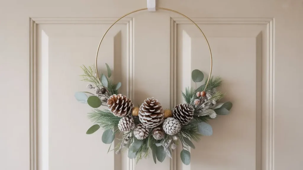 - What you’ll need: A metal or wooden hoop (embroidery hoops are perfect), a collection of pinecones, some faux eucalyptus or cedar sprigs, floral wire, and a hot glue gun. For the frosting, you can use white craft paint and a dry brush, or a can of snow spray.