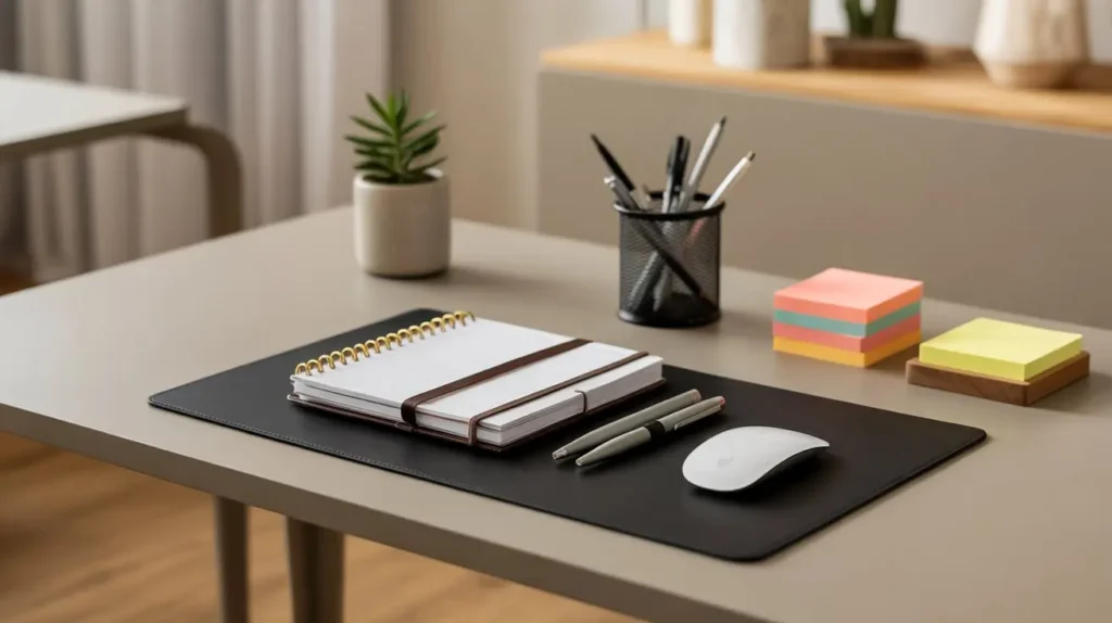 Think desk organizers, a quality notebook and pen setsticky notes in fun designs, a small desk plant, maybe a motivational desk calendar or inspiring art print. The goal is creating a space that makes people want to sit down and get stuff done.