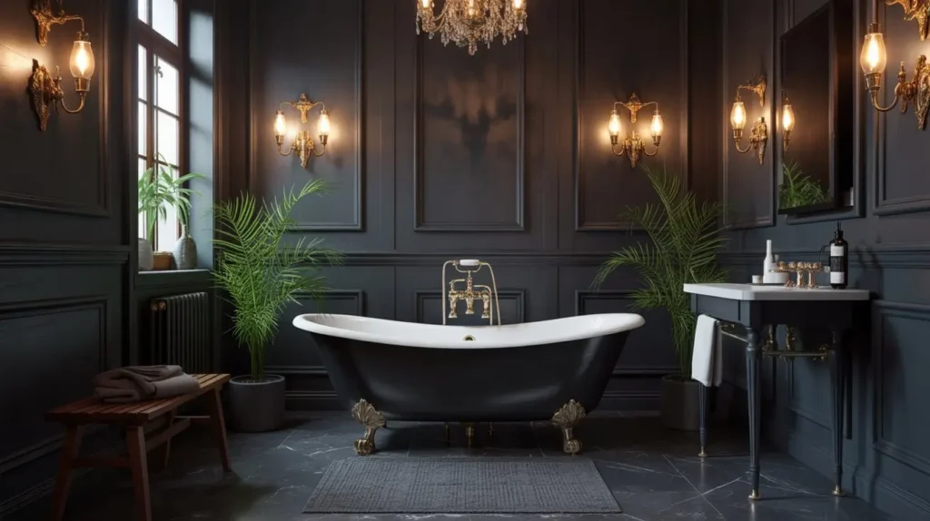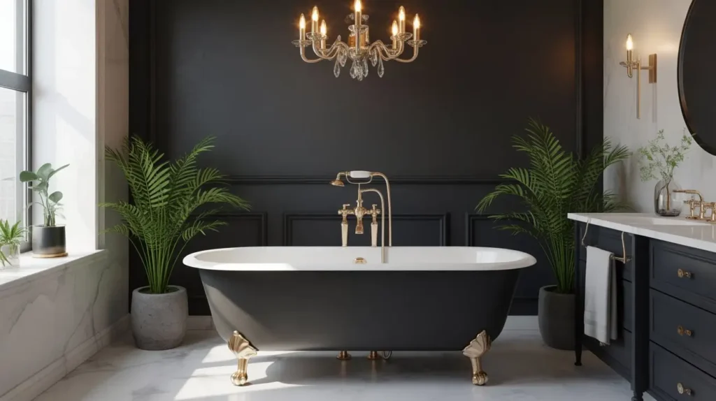 - White or light-colored clawfoot tub for contrast against dark walls