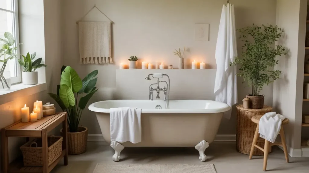 The spa experience extends beyond aesthetics. Consider adding a small sound system for ambient music, aromatherapy diffusers, and high-quality bath products. Store everyday items out of sight so the space feels like an escape rather than a utility room.