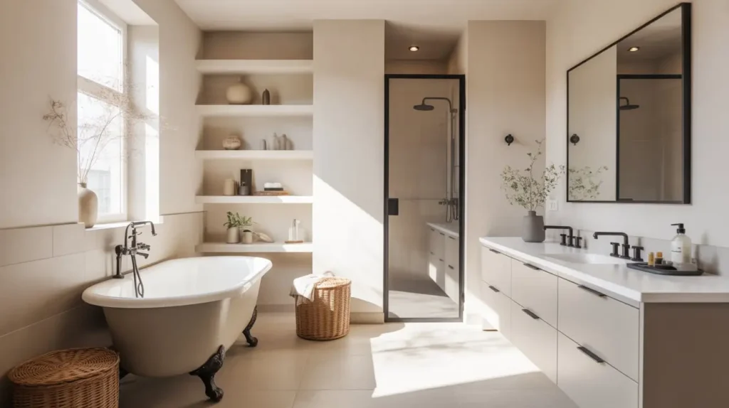 A modern minimal clawfoot tub bathroom proves that you don’t need ornate details to make a statement. The tub itself becomes the star, and everything else plays a supporting role. You’re stripping away the excess and letting the architecture breathe.