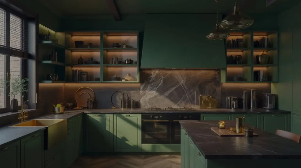 Moody Dark Green Kitchen with Warm Lighting