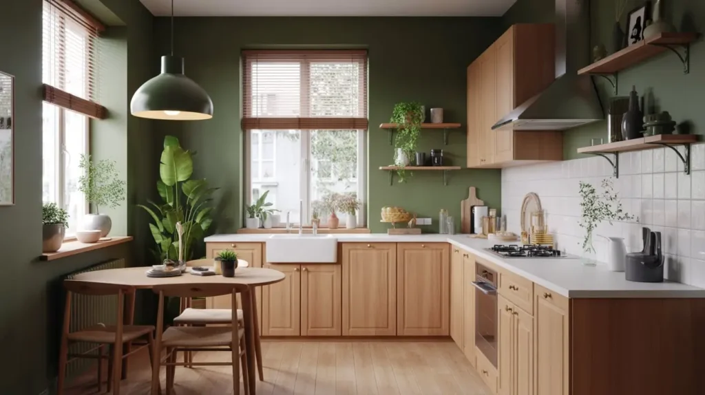 Dark Green Walls with Light Wood Cabinets