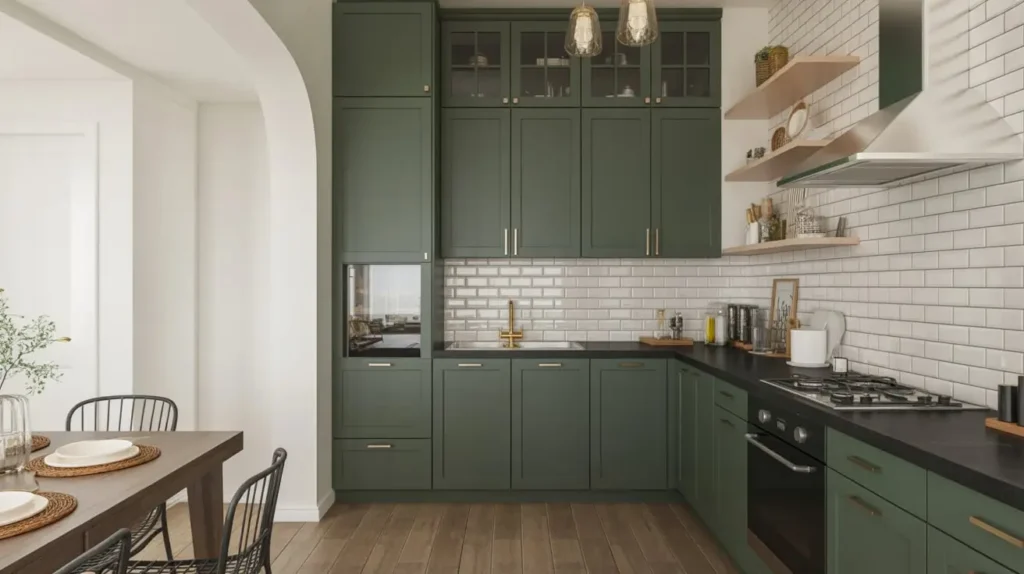 This style embraces clean lines, functional design, and a restrained color palette. Your dark green cabinets might be the only bold element, with everything else kept minimal – white walls, light wood floors, simple hardware, and plenty of natural light.