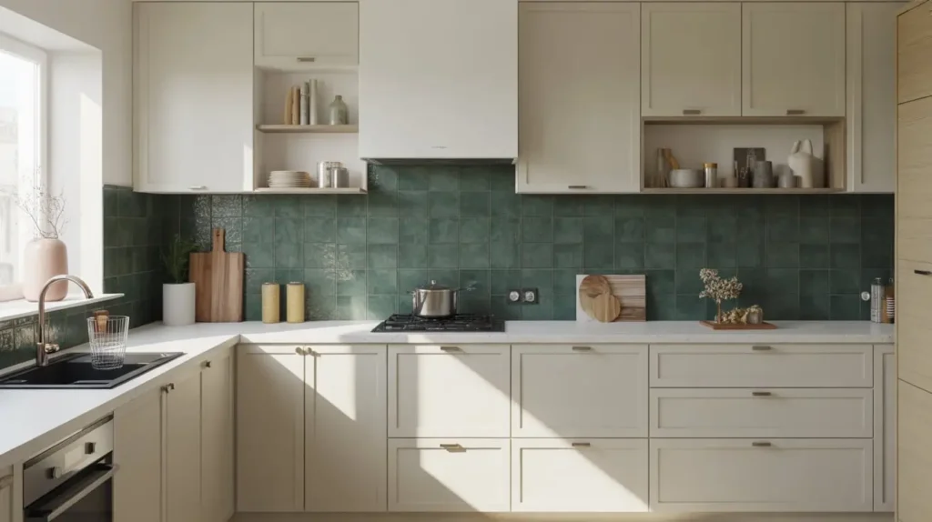 Sometimes you want dark green in your kitchen but don’t want it to dominate every surface. Enter the dark green backsplash.