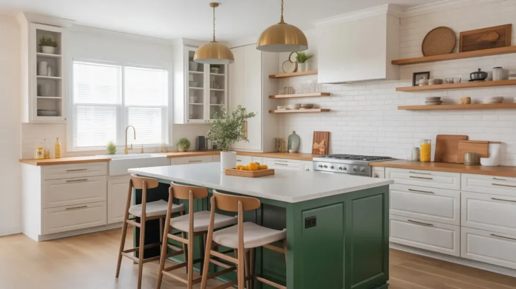 A forest green and white two-tone kitchen gives you the best of both worlds. You can go bold with deep green lower cabinets while keeping upper cabinets (or open shelving) white to prevent the space from feeling cave-like. This approach works especially well in kitchens with limited natural light.