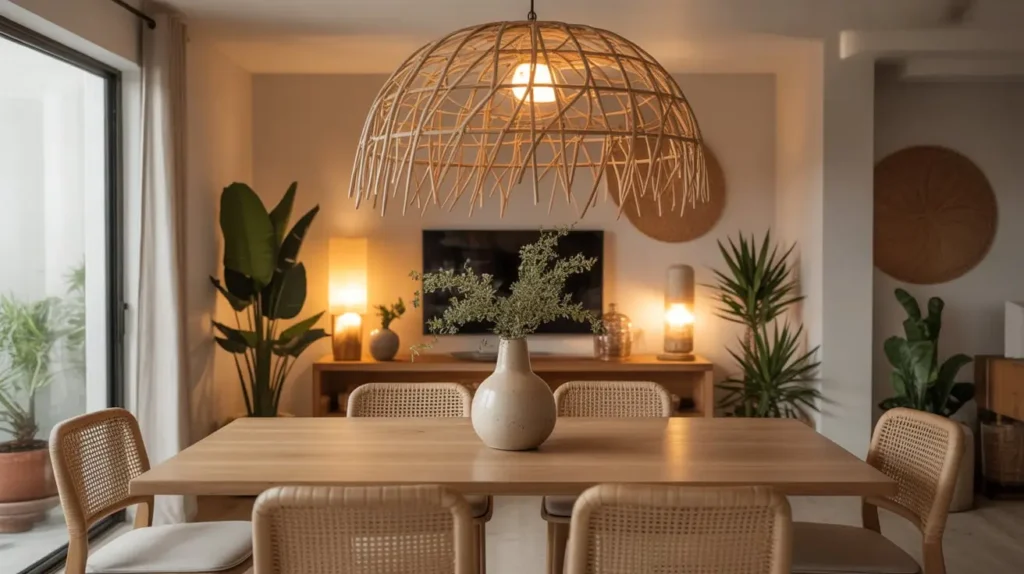 Bring on the boho vibes! An oversized rattan or wicker pendant is the ultimate way to add natural texture and a relaxed, breezy feel to your dining room. It’s like a permanent vacation for your ceiling.