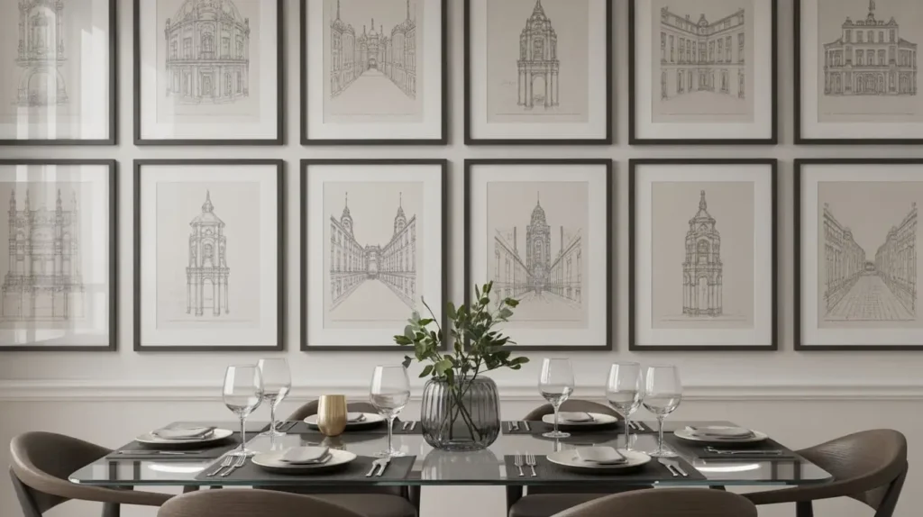 For a look that is intellectual, sophisticated, and clean, consider a series of framed architectural line drawings. This could be anything from classical building elevations and floor plans to modern, abstract architectural sketches.