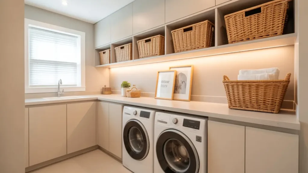 Floating cabinets create a clean, modern look because they don’t touch the floor. This visual trick makes the room feel lighter and more spacious. The real magic, though, is the “hidden baskets” part of this hack. Inside the cabinets, you can use simple bins or baskets to corral all your supplies. One for cleaning rags, one for dryer sheets, one for all those rogue stain sticks. It’s organized chaos, but it’s your organized chaos.