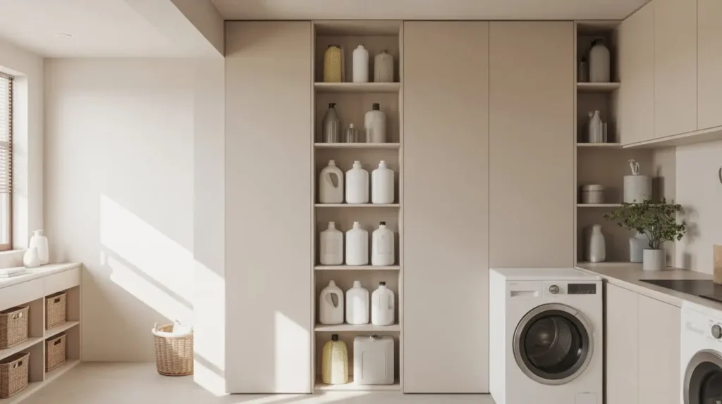 Let’s start with the golden rule of any small space: when you can’t build out, you build up. If your detergent bottles, stain removers, and fabric softeners are currently having a party on top of your dryer (or on the floor), vertical shelving is your new best friend. It’s the simplest, most effective way to reclaim your space and your sanity.