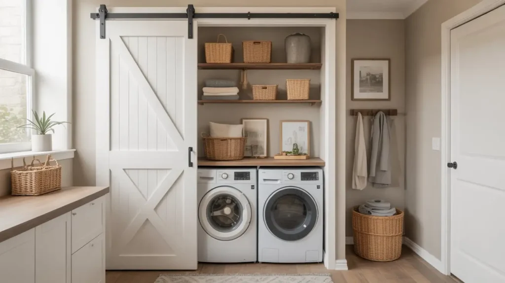 From a design perspective, a barn door is a statement piece. It can add a pop of color or a dose of rustic texture that completely transforms the look of the area. It turns a boring utility closet into a deliberate design feature.