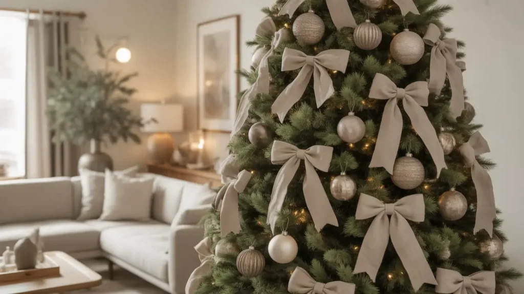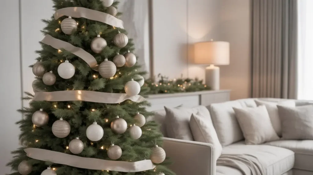 • Ribbon: Get a wide, high-quality linen or cotton ribbon in a natural, undyed color. You can also use a sage green velvet ribbon for a touch of luxury. Don’t just wrap it around the tree; create big, floppy bows or cascade it down in vertical strips.