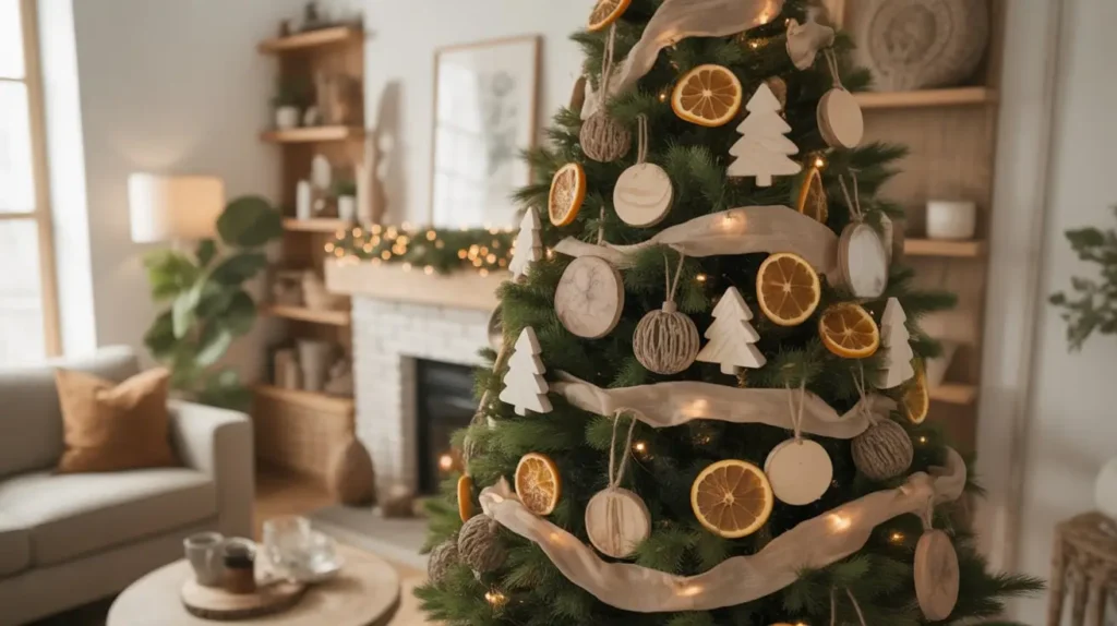 • Accents: Simple twine-wrapped ornaments, small bundles of cinnamon sticks tied with twine, and dried orange slices add to the natural, handmade feel.