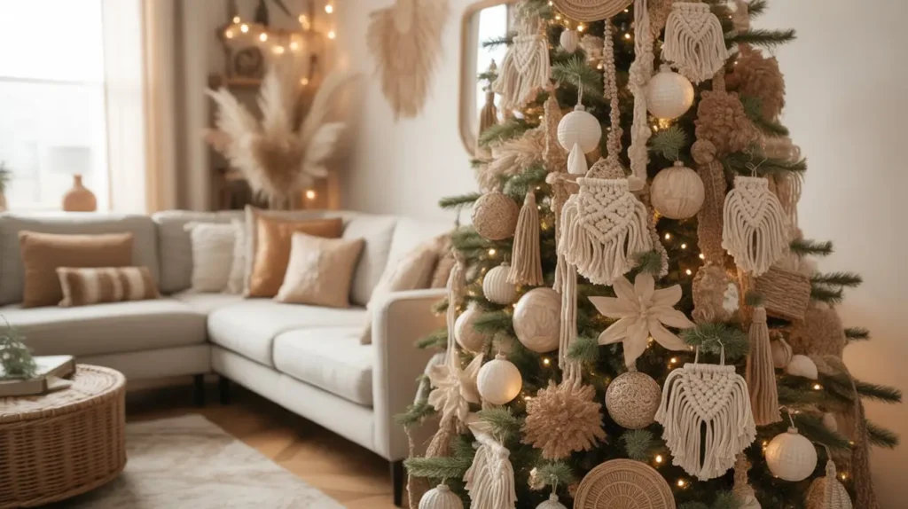 • Ornaments: Look for ornaments made from natural, light-colored materials. Think raffia-wrapped balls, ceramic ornaments in a sandy or sandstone finish, and woven straw or rattan shapes.