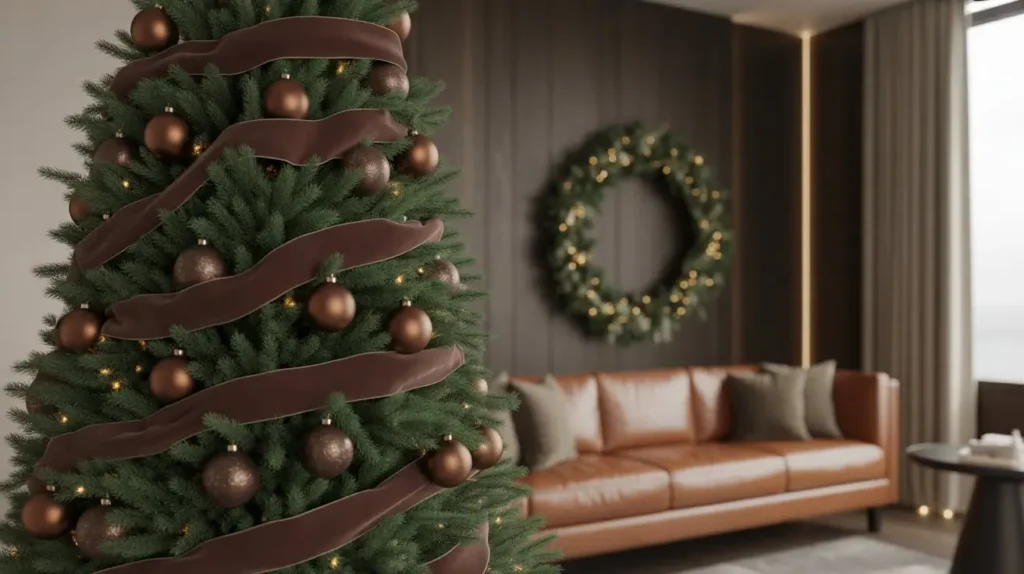 • Texture: This is where you bring in the “luxe.” A few deep brown or charcoal gray velvet ornaments or a simple velvet ribbon can add softness. Faux leather elements, perhaps as ornament ties or a simple garland, add a modern edge.