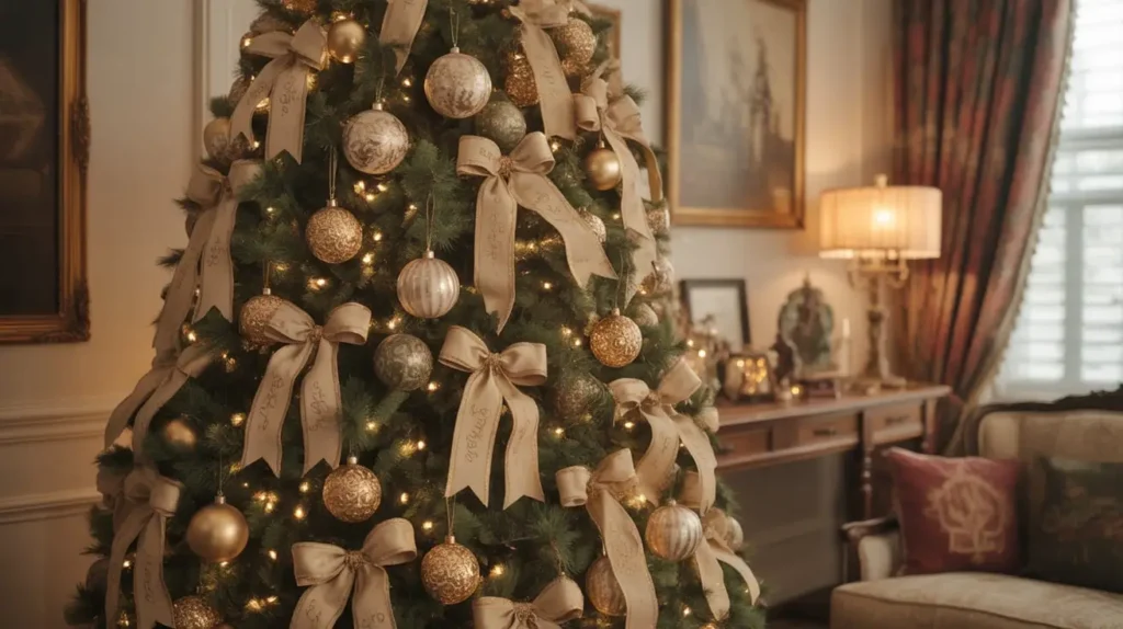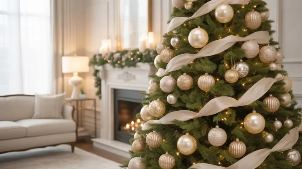 - The Tree: A champagne-colored tinsel tree or a heavily flocked tree with warm lights is the perfect base. The warm tones are essential here.