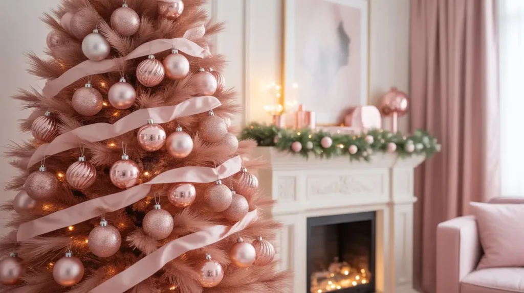 Rose gold can sometimes look a little… cheap if not done carefully. The trick to making it look luxe is to pair it with a deep, contrasting color in very small doses. My favorite is a deep burgundy or plum. Tuck a few dark burgundy velvet ornaments or floral picks deep into the tree. This tiny touch of darkness makes the rose gold look richer and more intentional.