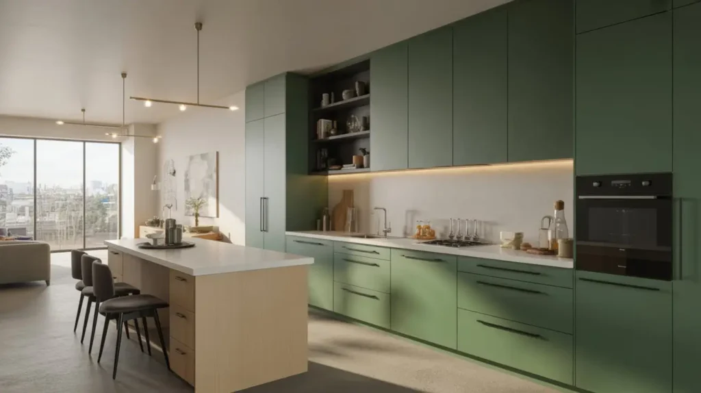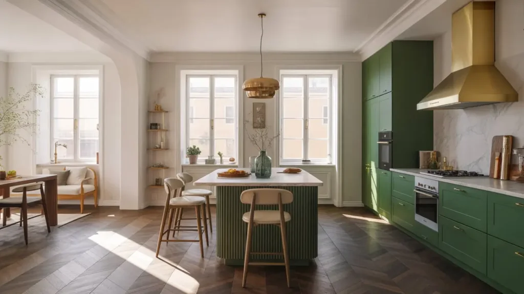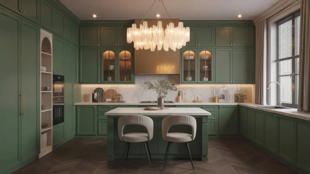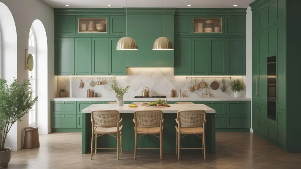 Let me walk you through 15 ways to bring this luxurious shade into your kitchen, whether you’re planning a full renovation or just want to add some green goodness to your space.