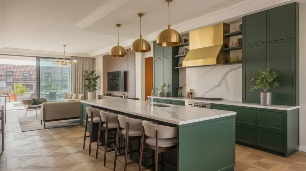 - High-gloss emerald cabinets that reflect light and make your space feel bigger