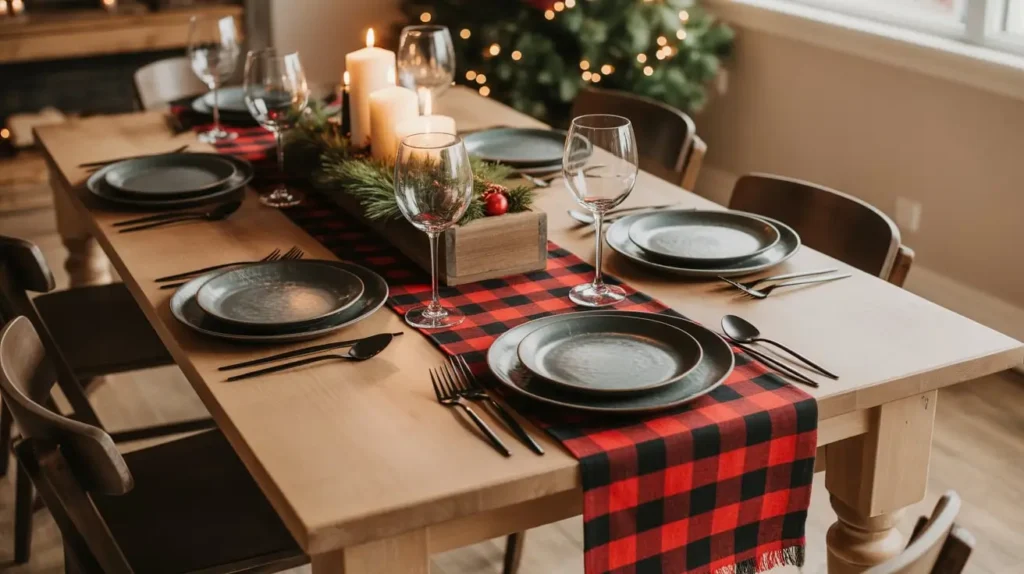 I built my Christmas tablescape around a buffalo plaid table runner—classic red and black, because why mess with perfection? The beauty of this pattern is that it’s bold enough to make a statement but traditional enough to not feel trendy.