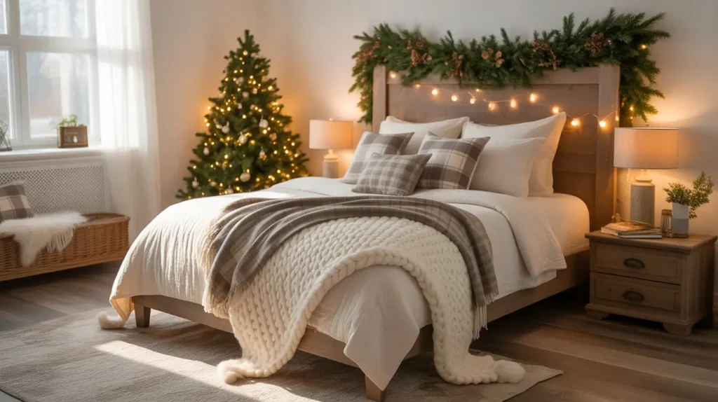 Your bedroom should be your sanctuary, and adding soft holiday layers in a farmhouse style makes it even cozier during winter.