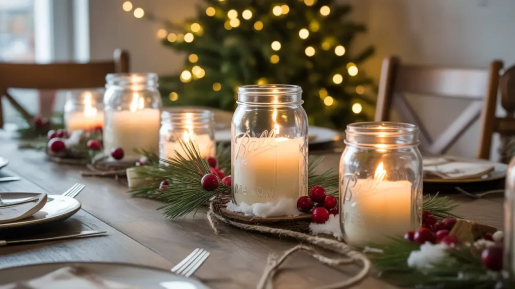 I arranged five jars down the center of my dining table on a wooden board. Some have candles, some have greenery, and one has lights. The mix creates this collected, imperfect look that’s so much more interesting than matching candles in a row.