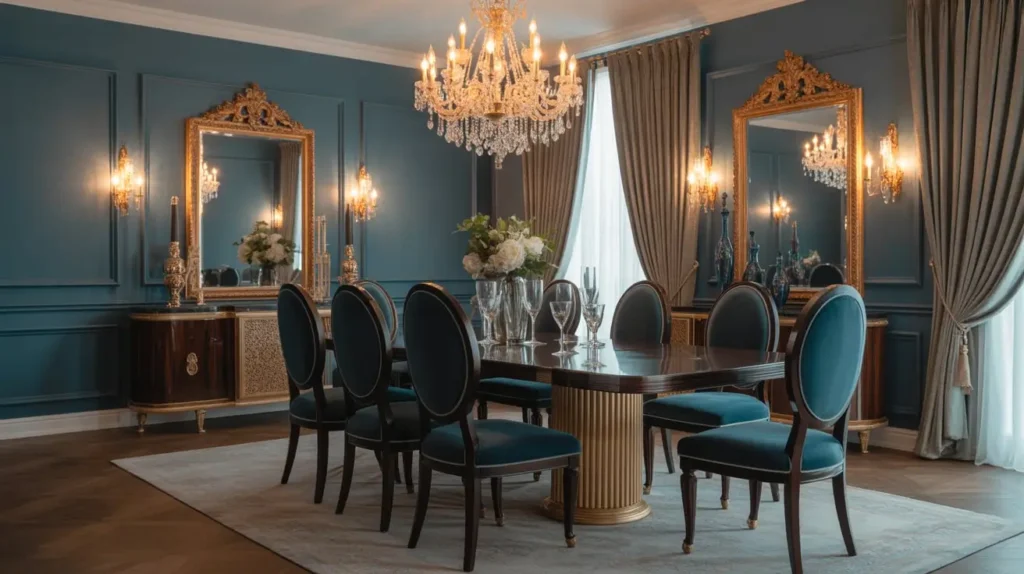 • The Details: A large, ornate mirror, a traditional sideboard or buffet for storage, and luxurious textiles like silk or velvet for curtains and upholstery complete the picture.