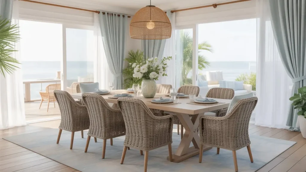• Natural Materials: This style relies heavily on natural, textural materials. A light wood or whitewashed dining table is a perfect start. Add in chairs made of rattan, wicker, or light-colored wood.