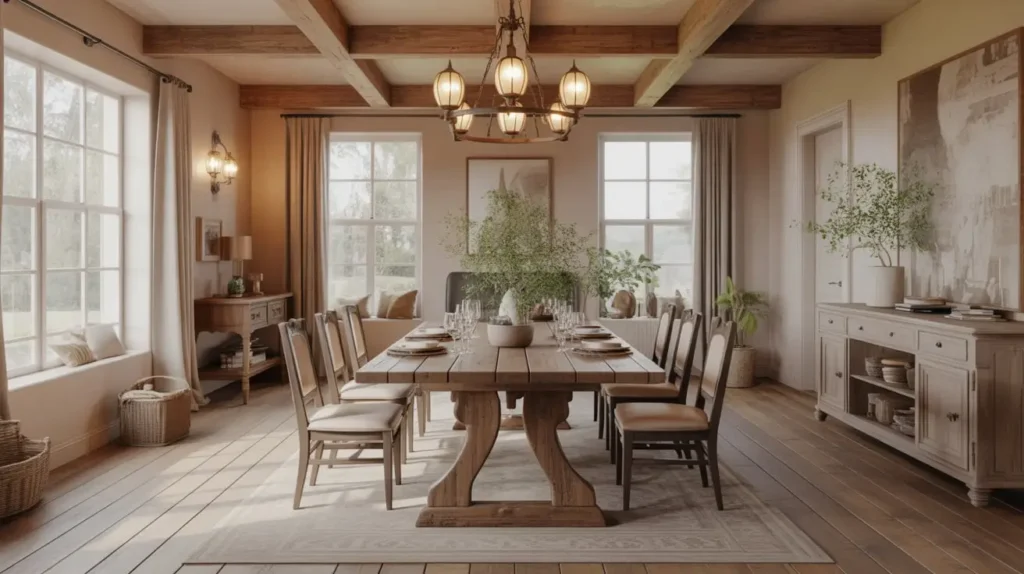 • The Table: A solid wood dining table with a natural, slightly unfinished look is the heart of the room. A reclaimed wood table with all its knots and imperfections is ideal.
