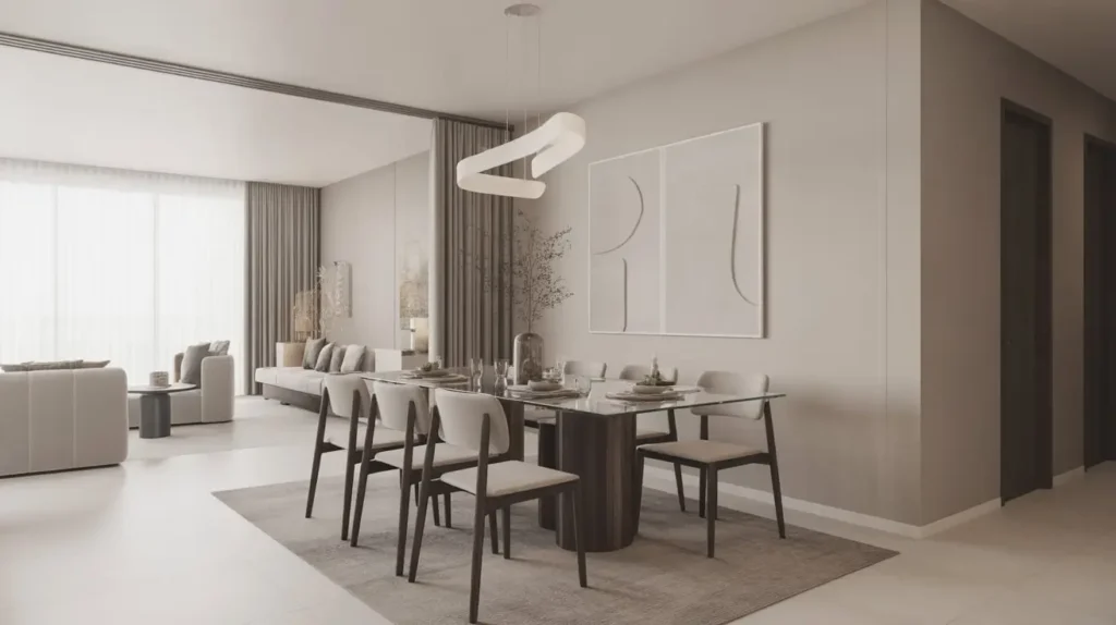 • Lighting: A single, sculptural pendant light is often all you need. It serves as the room’s one major decorative statement.