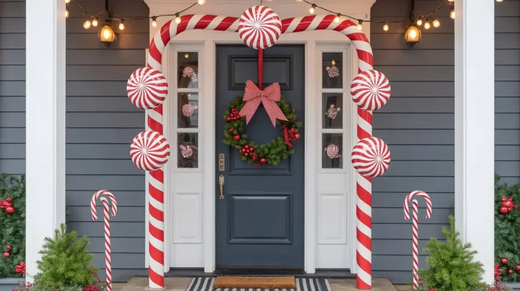 - Go Literal: Don’t be shy about using actual candy cane motifs. Large-scale candy cane decorations staked into planters or leaning against the wall create a huge impact. Hang smaller (or real!) candy canes from the branches of your wreath.