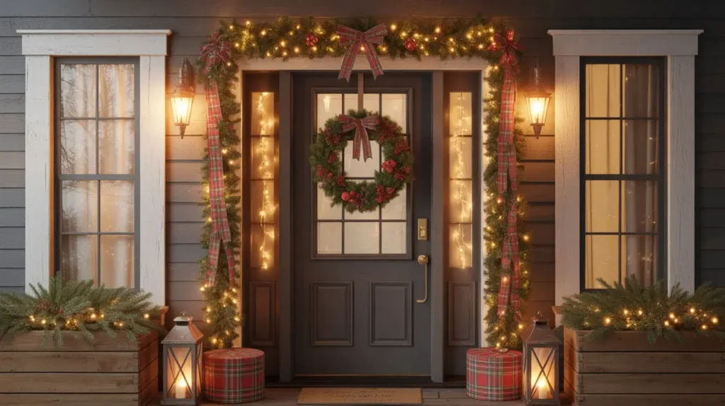 - Lush Greenery Everywhere: This is the foundation. A thick, beautiful evergreen wreath on the door, matching thick garlands framing the entryway, and evergreen trees or topiaries in planters.