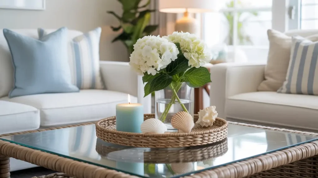 You don’t have to live by the sea to appreciate a breezy, coastal vibe. This style is all about creating a relaxed, airy, and light-filled atmosphere, and it pairs perfectly with a glass coffee table. The transparency of the glass mimics the clarity of water and enhances the feeling of openness.