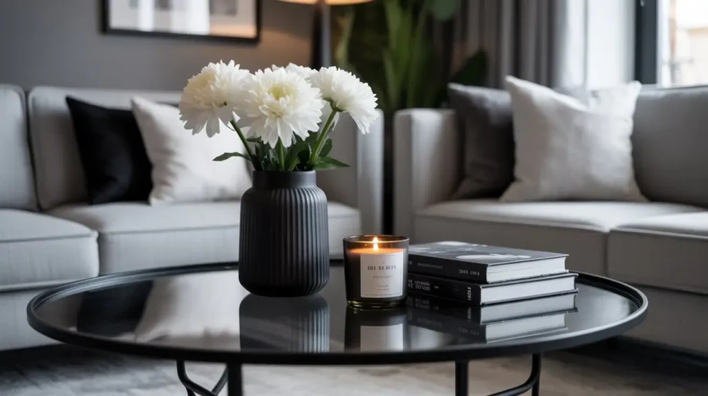For a look that is undeniably sleek, sophisticated, and modern, you can’t go wrong with a monochrome palette. Sticking to black, white, and shades of grey creates a powerful, cohesive statement. On a glass table, this look is particularly effective because the clear surface acts as a neutral divider, allowing the black and white elements to pop.