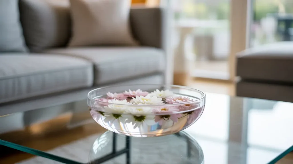 Imagine beautiful flower heads floating in a shallow bowl of water. The light catches the water, the petals add color, and the whole thing looks incredibly elegant and serene. Because the arrangement is low, it doesn’t obstruct views across the room or block the TV—a practical bonus!