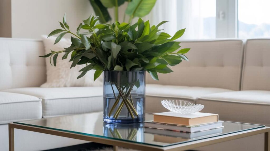 Bringing plants into your home is always a good idea. They purify the air, add a pop of life, and just make people happy. On a glass coffee table, the effect is even more striking. The green leaves seem to float in mid-air, creating a beautiful, airy look that connects your indoor space with the natural world.