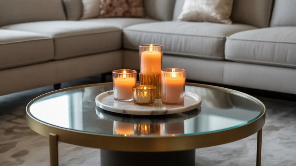 I highly recommend placing your candle collection on a tray. A marble, metal, or slate tray will not only ground the arrangement and make it look more intentional, but it also serves a very practical purpose: it protects your glass from wax drips. Seriously, cleaning hardened wax off a glass table is a special kind of punishment. A tray contains the mess and makes the whole setup easy to move when you need to clean the table.