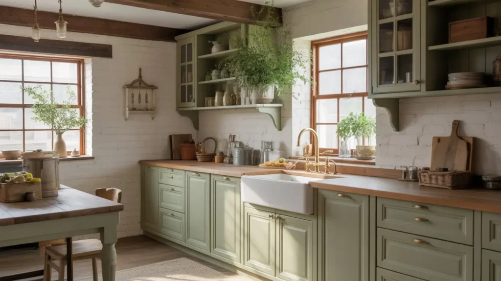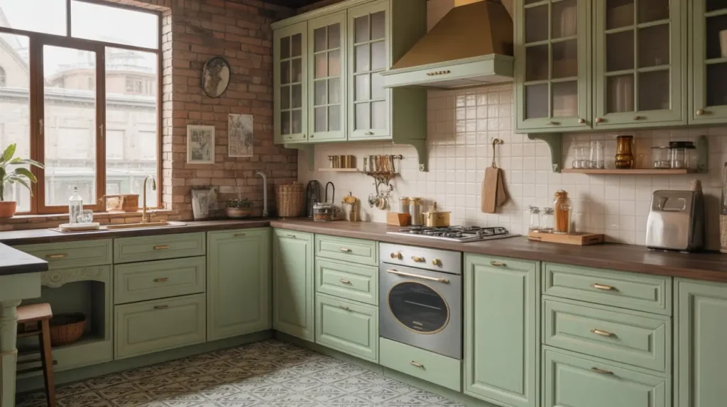 Think soft mint green or jade green cabinets with patinated gold fixtures that have that aged, antique look. Add some vintage-inspired appliances, maybe a farmhouse sink, and suddenly you’re cooking in a space that feels full of history and character.