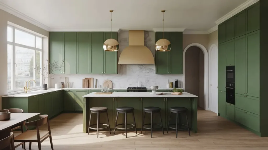 14. Matte Green Kitchen with Gold Accents and White Walls