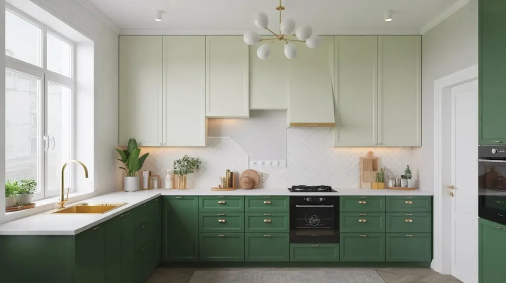 The most common approach? Dark green lower cabinets with lighter green or white upper cabinets, unified with matching gold hardware throughout. This combination gives you the drama of dark green where it grounds the space, while keeping the upper half lighter so your kitchen doesn’t feel closed in.