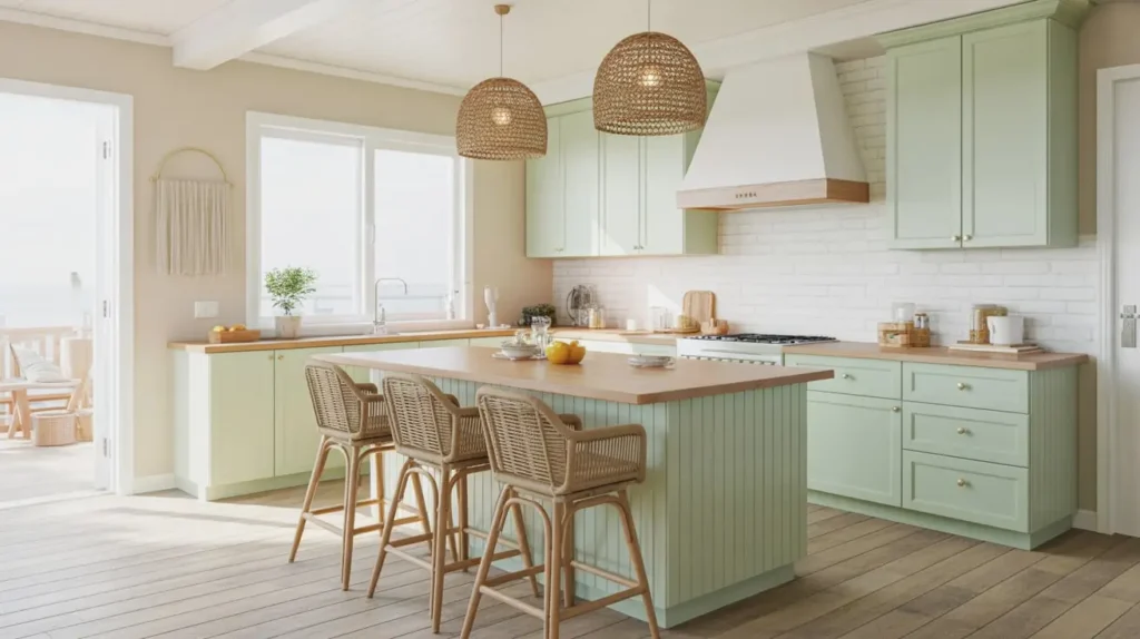 Last but definitely not least, let’s talk about bringing green and gold into a coastal-style kitchen. Think soft seafoam or sage green with warm gold accents, natural textures, and that breezy, relaxed vibe we all associate with beach houses.