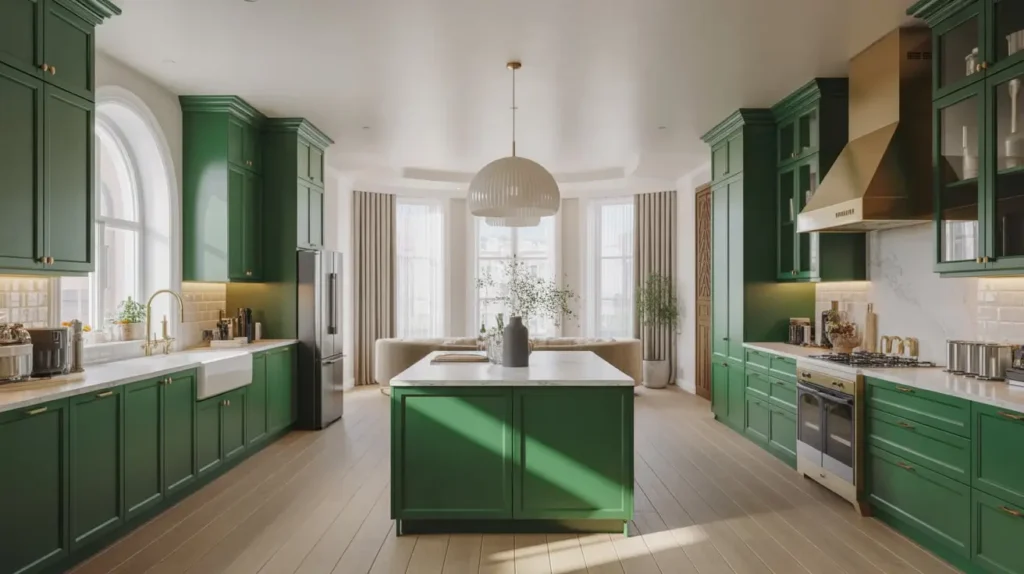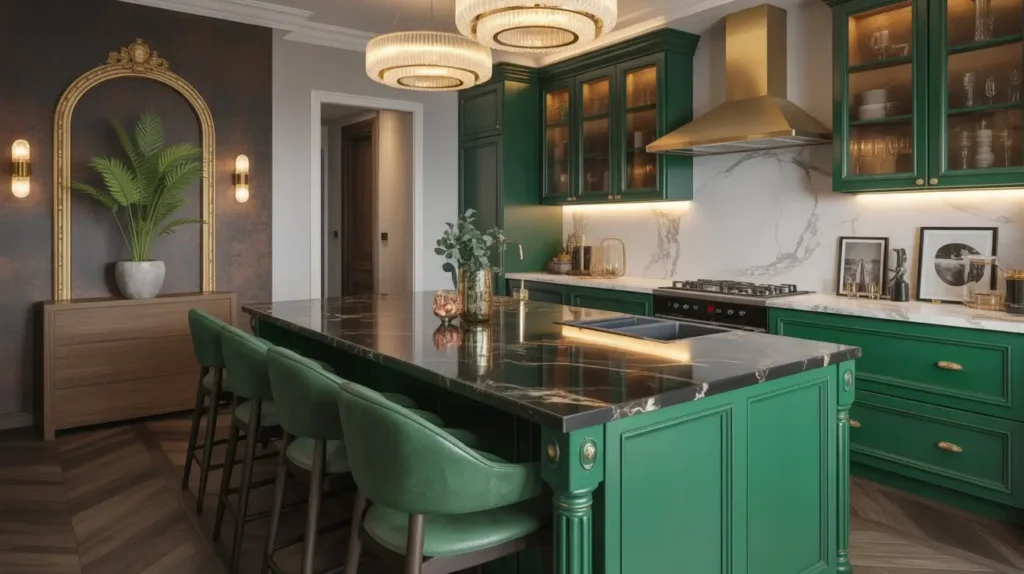 I’ve seen modern emerald kitchens that look absolutely incredible with white or light gray countertops. The contrast keeps things from feeling too heavy or dark. Add some sleek, integrated appliances and minimalist design elements, and you’ve got a kitchen that screams sophisticated modern luxury.