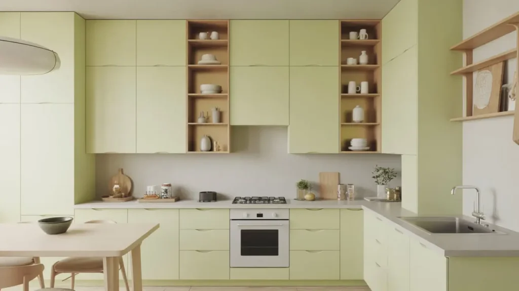 - Soft green cabinets (seafoam, pale sage, or aqua-green)