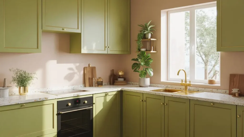 In smaller spaces, I recommend using lighter shades of green (sage, mint, or soft olive) to keep things feeling open. Add gold accents through small, thoughtful touches—cabinet handles, a gold faucet, maybe some gold-rimmed dishes on open shelving.