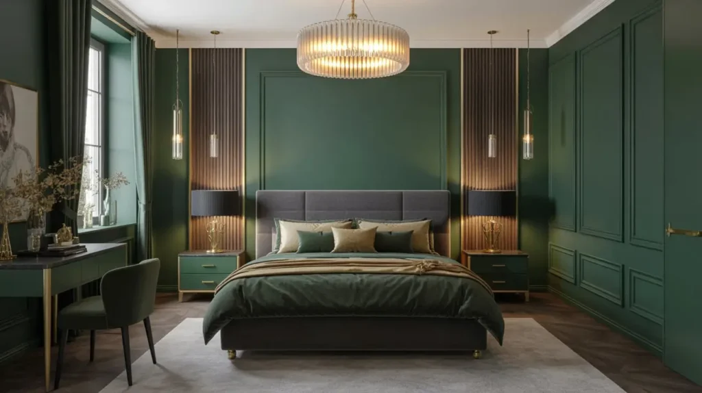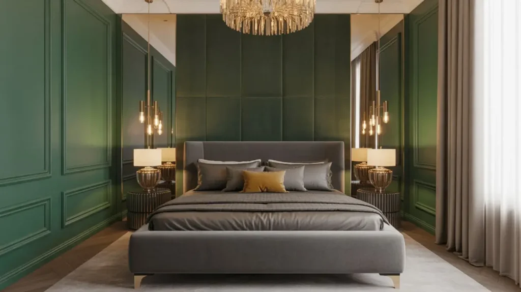 Emerald green is bold, rich, and undeniably glamorous. When you pair it with deep charcoal gray, you get a combination that feels luxurious but never pretentious. This is the bedroom that makes guests say “wow” when they walk in.