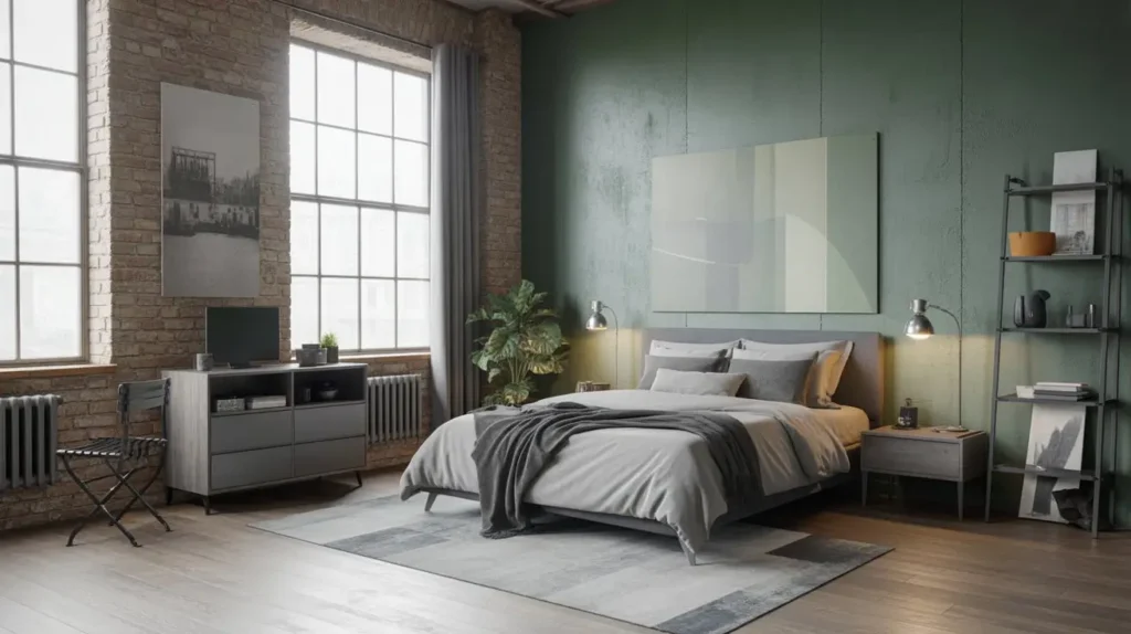 Got exposed brick or high ceilings? A green and gray industrial bedroom celebrates raw architectural elements while still feeling livable.