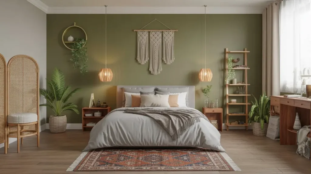 The foundation starts with natural materials. Think weathered wood furniture, woven baskets for storage, and chunky knit throws draped across the bed. Your green here can lean toward olive or hunter tones, which pair beautifully with warm gray undertones.