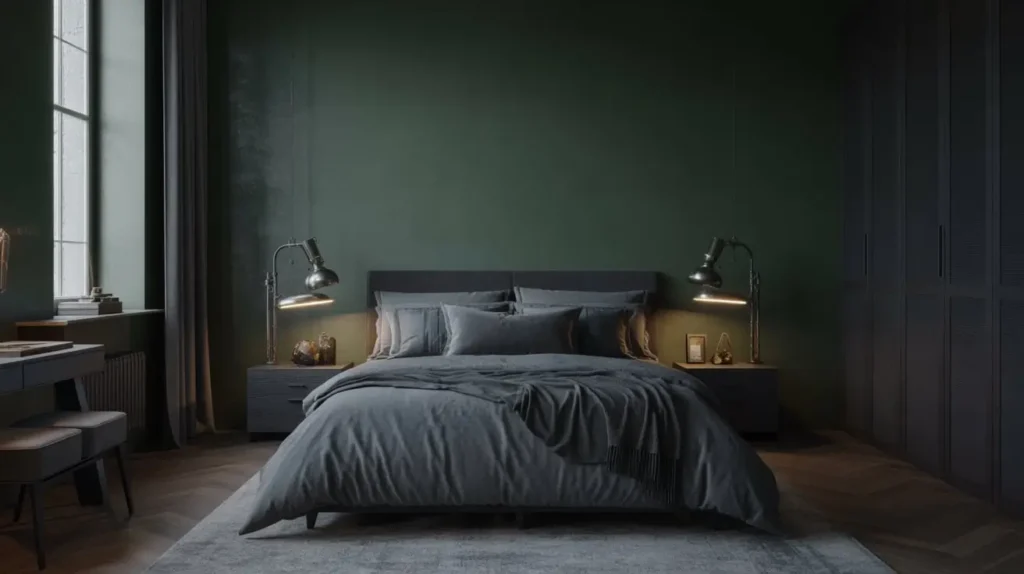 Ready to embrace your dark side? A moody forest green and slate gray bedroom creates atmosphere like nothing else.
