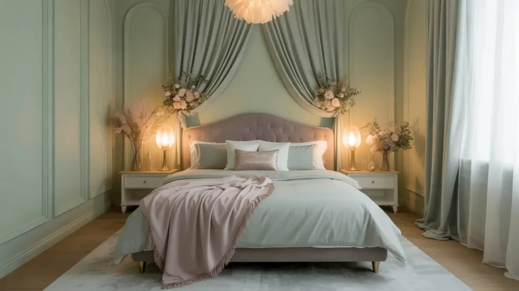 Romance doesn’t require pink. A pastel green and gray romantic bedroom creates soft, dreamy vibes with unexpected sophistication.